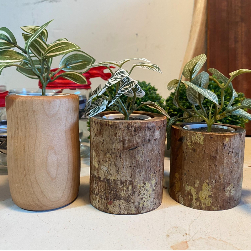 TOO CUTE!!!! Mini planters made from a variety of woods. Spalted Ambrosia maple, palm tree, cherry and maple. Perfect for holding a candle, lil plant and more. It adds just the right touch to a window sill, office or nightstand!