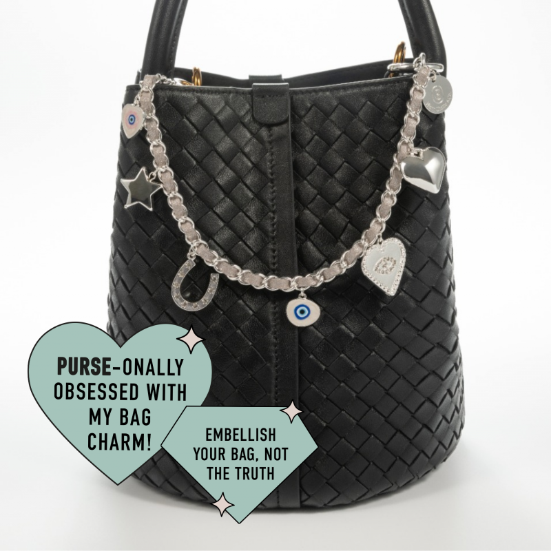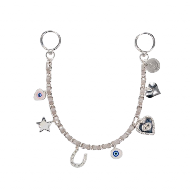 Bag Charm featuring 100% Silver Suede woven throughout Silver Plated Chain adorned with various 14k Gold Plated Pendant Charms including Gemstone Horseshoe, Star, Heart and Hand-Painted Evil Eye Charms.