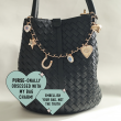 Bag Charm featuring 100% Black Suede woven throughout 14K Gold Plated Chain adorned with various 14k Gold Plated Pendant Charms including Gemstone Horseshoe, Star, Heart and Hand-Painted Evil Eye Charms.