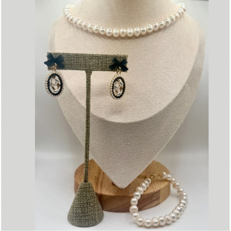 Complete your look with the Timeless Pearl Jewelry Set, featuring a genuine freshwater pearl necklace, a matching bracelet, and sparkling rhinestone-framed pearl earrings. This elegant trio blends classic beauty with a hint of glamour, making it the perfect accessory set for special occasions or everyday sophistication.