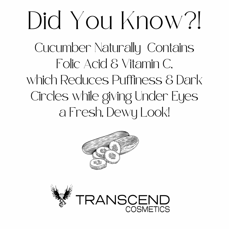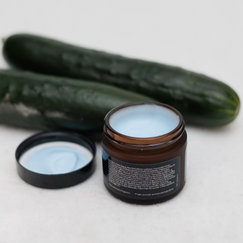 Our Soothing Cucumber Herbal Eye Gel will calm and soothe tired looking eyes. The blend of fruit and herbal extracts, such as eggplant, ginger, and turmeric aid in removing dark circles under the eyes. The blue color is natural from the eggplant in the formula. Also contains Aloe, Avocado, Jojoba, and Basil. This will instantly lift your under eyes with our gel formula which sinks into skin faster while being lightweight.