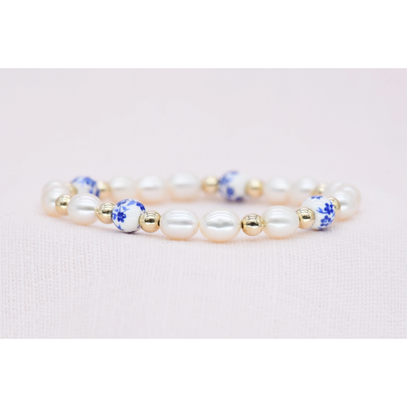 A timeless blend of gold-filled beads, delicate porcelain, and signature rice pearls. This refined bracelet combines elegance and modern charm, perfect for elevating any look.