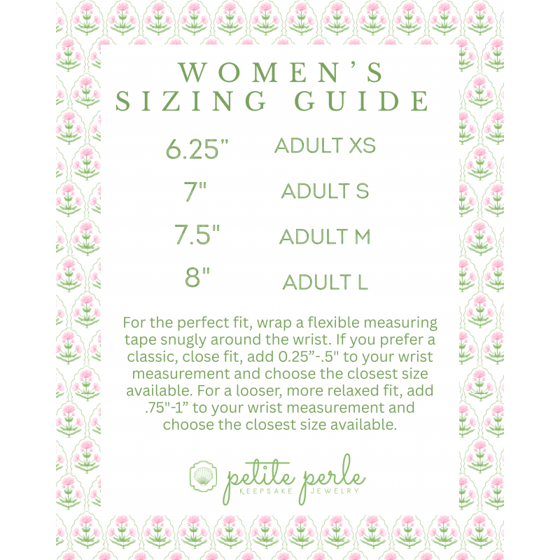 **Please supervise children carefully when wearing their Petite Perle pieces, as small components can pose a choking hazard. We recommend that you remove your child’s bracelet when they sleep or are otherwise unattended. Please ensure that the bracelet fits well, and does not slip off or feel tight.