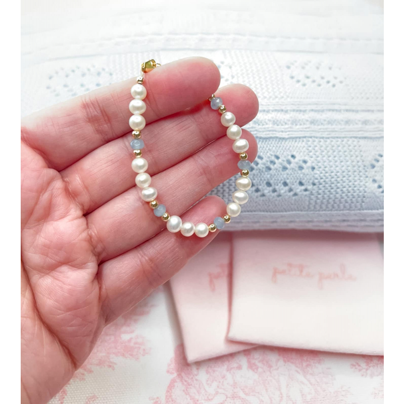 The Sofia Bracelet in Powder Blue Agate – Feminine and delicate, this bracelet combines semi-round freshwater pearls, Powder Blue Agate beads, and gold-filled details, creating a sweet and timeless piece.