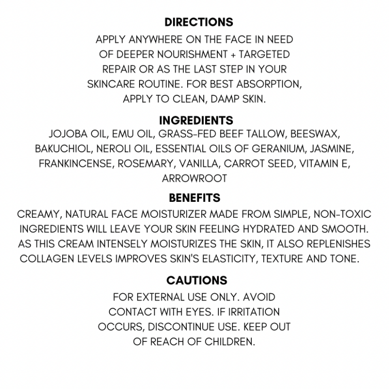 HOW TO USE: Apply anywhere on the face in need of deeper nourishment + targeted repair or as the last step in your skincare routine. For best absorption, apply to clean, damp skin.