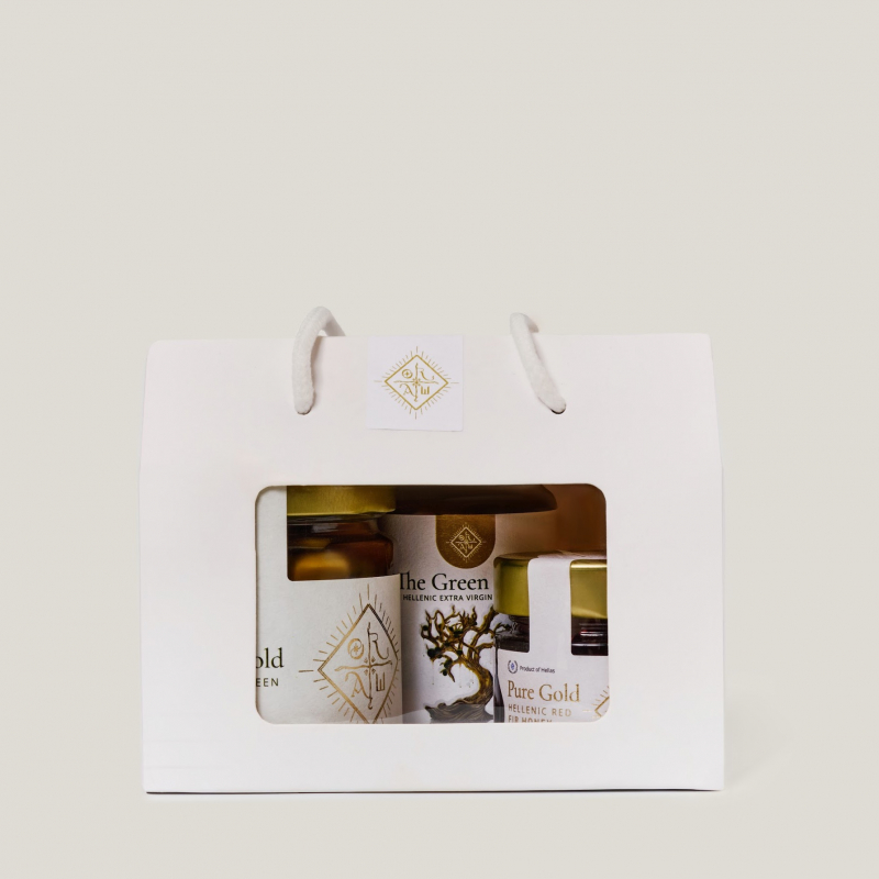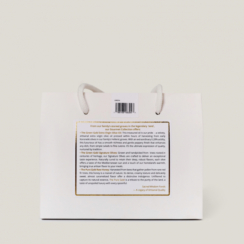 A refined trio of our most cherished offerings, beautifully curated to awaken the senses and celebrate Hellenic purity. This tasting collection includes our high-phenolic estate-exclusive olive oil (100ml), hand-cracked Tsakites Olives in pure brine, and our rare Red Fir honey (115g)—harvested at high altitude and known for its mineral depth. Ideal as a gift or introduction to Sacred Wisdom Foods, this set invites you to experience the essence of our land with elegance and intention.