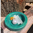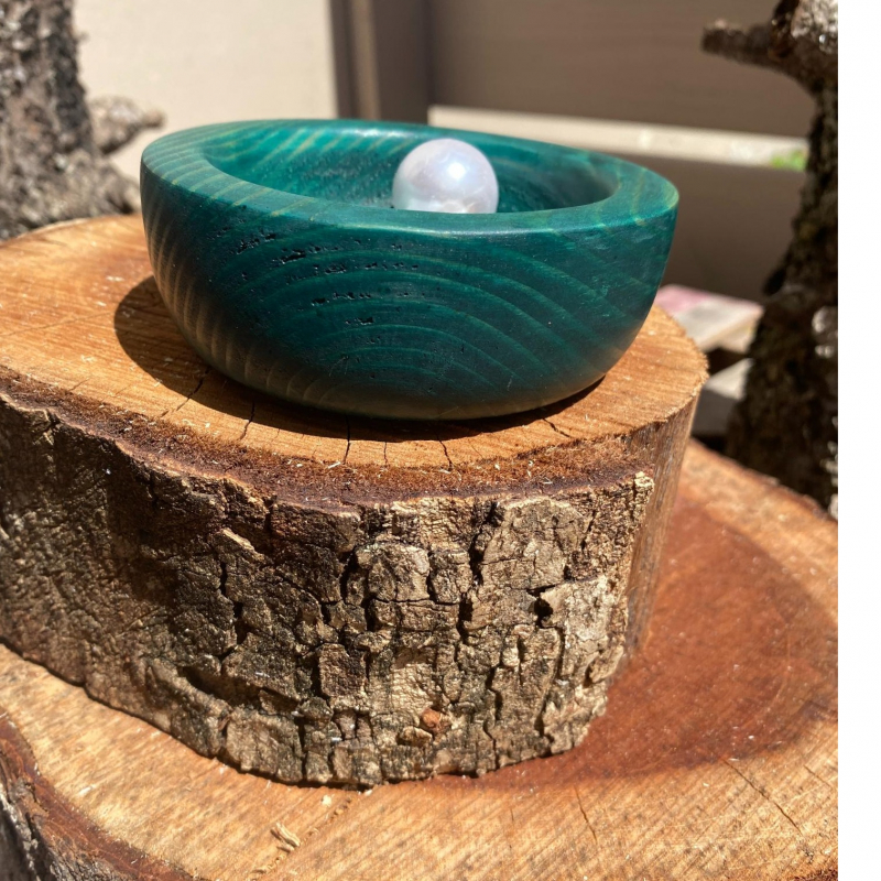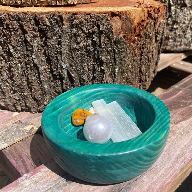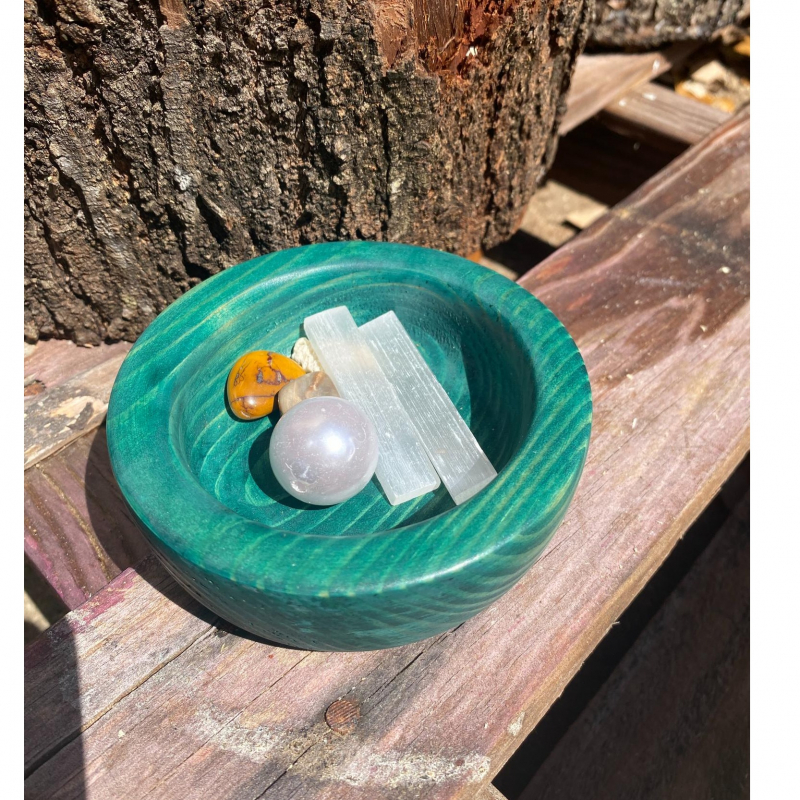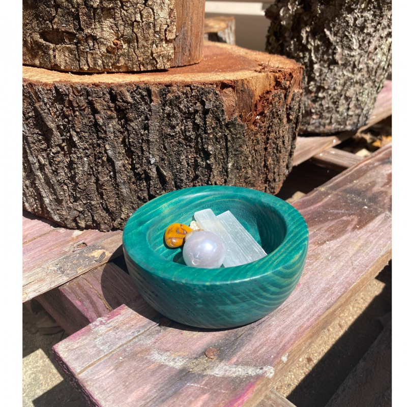 I call this is Green Bean Bowl! Made from natural pine wood and turned into a little catch- all bowl It has been stained emerald green to make it a very unique piece! Pine Wood is derived from various species of pine trees and is esteemed for its versatility and wide-ranging applications. These coniferous trees are characterized by their straight trunks, tall statures, and unique needle-like leaves.