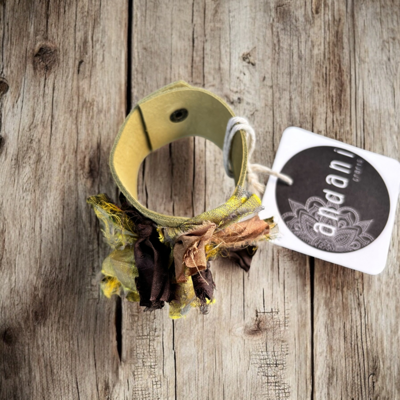 Handmade statement cuff in sage green leather with silk accents in sage green