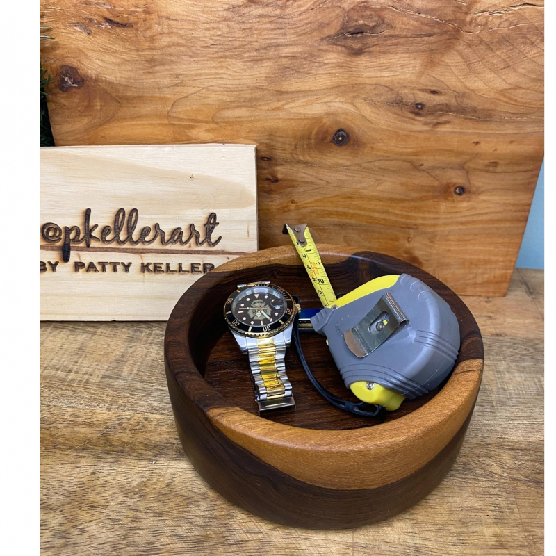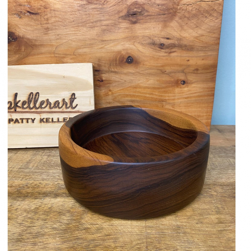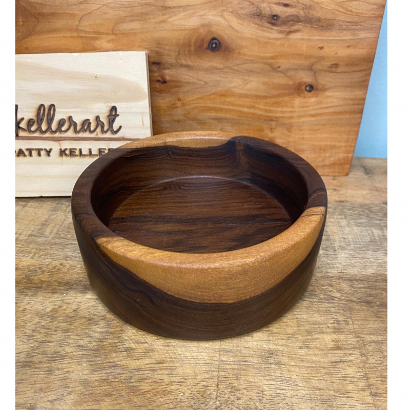This bowl is made from a found piece of Texas Rosewood. It turned beautifully on the lathe and it just might be my new favorite wood. I turned it into a beautiful bowl that reminds me of caramel vanilla and chocolate- therefore I names it the Ice Cream Bowl!!!