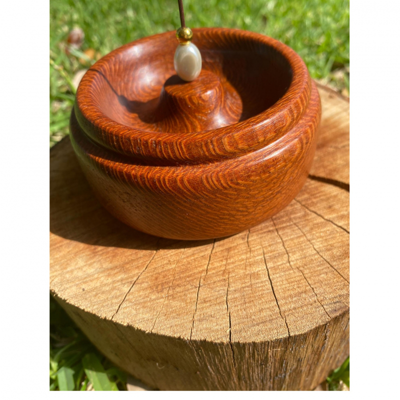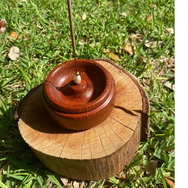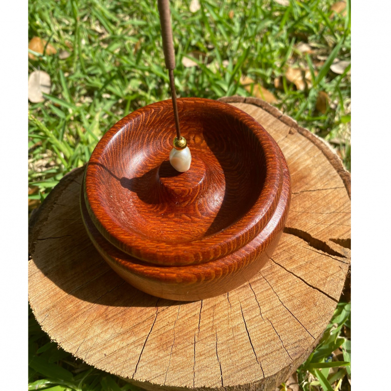 Leopard wood Incense holder with bead decoration. Crafted from leopard wood this solid incense holder is a beautifully hand made piece that blends traditional craftsmanship with modern design. The natural grain of the wood adds warmth and elegance make it an ideal gift for any incense lover.