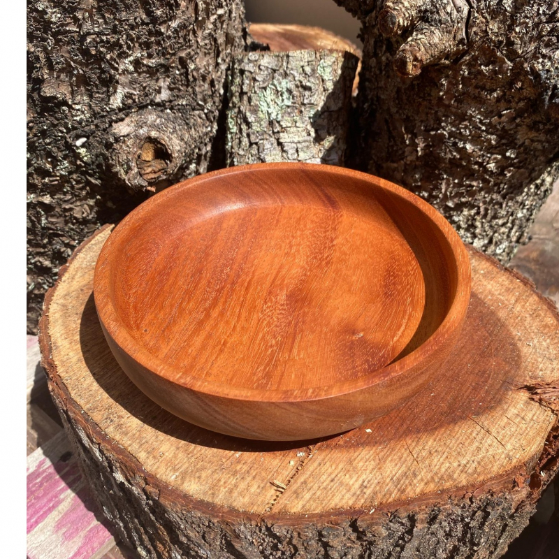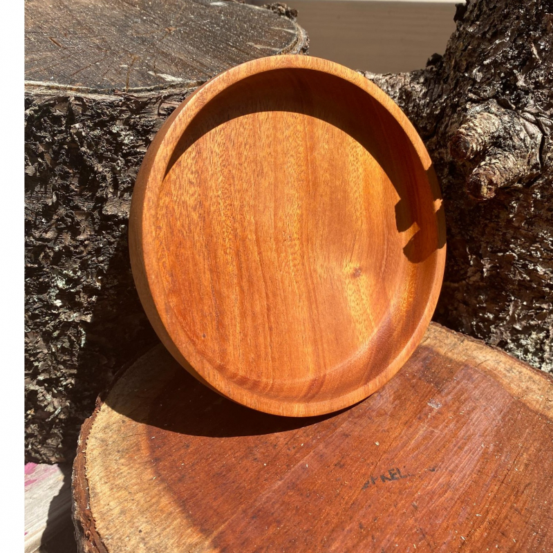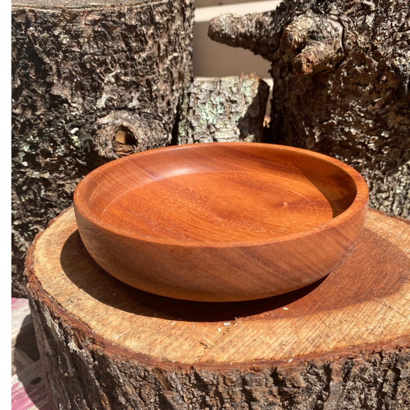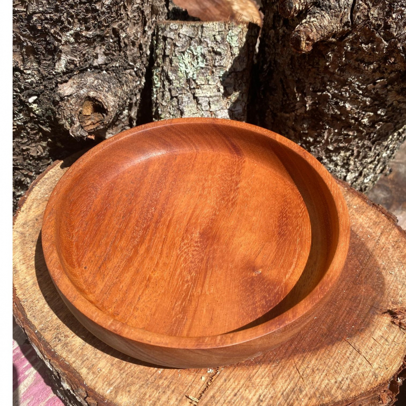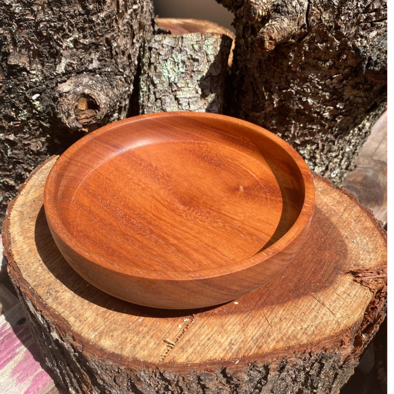 Gorgeous Mahogany Tray made as a beautiful catch all. At 7" across and 2" tall, this dish is made for wallets, keys, jewelry and so much more! Use this hand turned hardwood dish in so many ways throughout your home! Empty your pocket contents, hold your daily jewelry, organize an essential oil collection, display some treats for your guests!