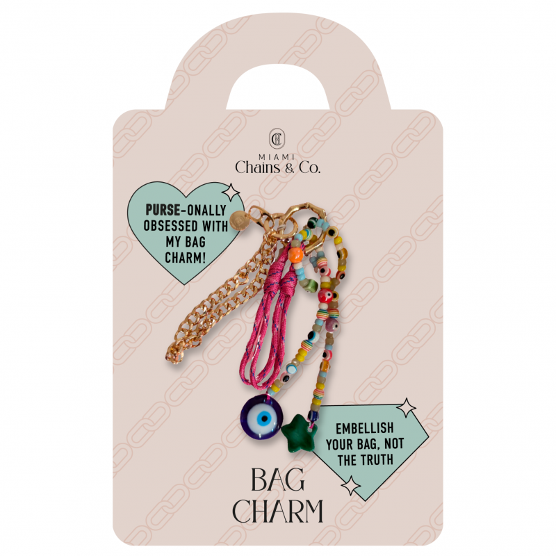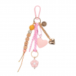Bag Charm featuring wooden beads engraved with the word MAMA. Silicone pendant shaped heart and flower pendants with 14k gold plated chain.