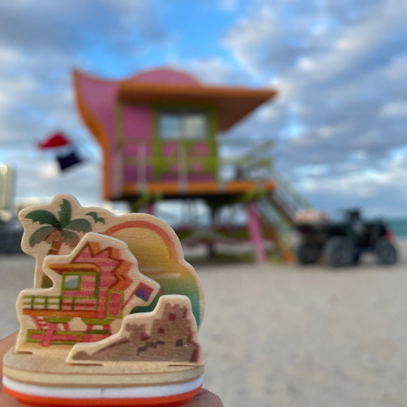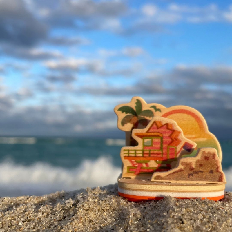 A sunset setting over the vibrant lifeguard tower alongside the Atlantic coast.