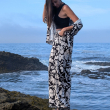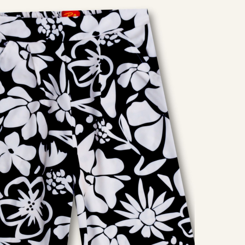 The Parce Manu Pant. Lightweight and silky smooth to the touch. Black and white floral pattern. Will keep you cool even on the hottest summer days.