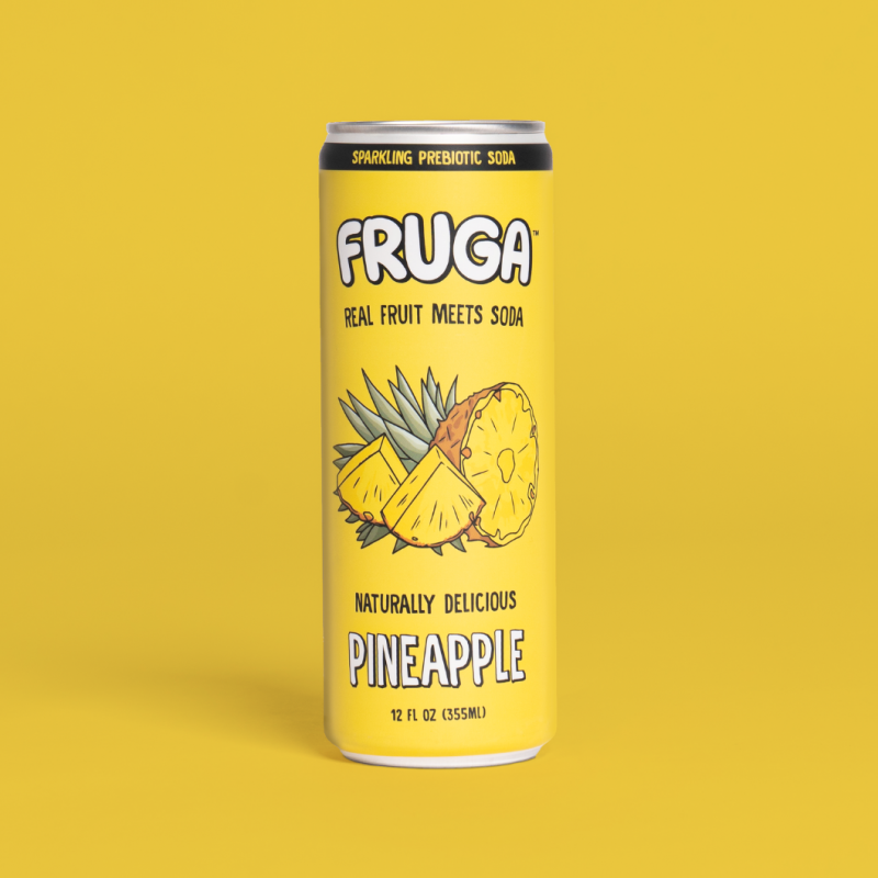 FRUGA Fruit Super Soda: A refreshing pineapple soda that’s bursting with real fruit flavor, plant fiber, and essential vitamins, crafted to promote gut health and enhance wellness with every sip.