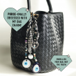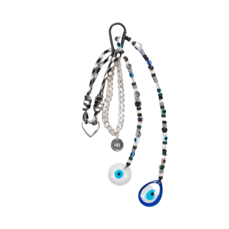 Bag Charm featuring Silver Plated Cuban Link Chain, Black + White Checkered Nylon Cord with wrapped strands of assorted/ evil eye beads with jumbo Evil Eye pendants on both ends