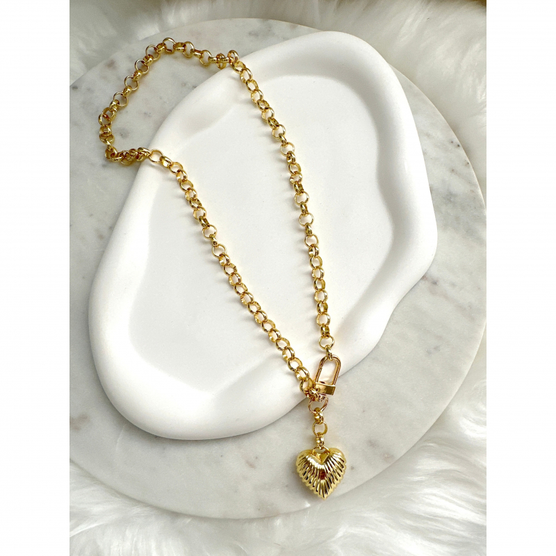 The Puffy Heart Lariat adds a touch of elegance to any outfit. At 21 inches in length, it can be worn alone or layered with other necklaces. The gold plated design features a charming puffy heart with a unique sunburn pattern, making it a must-have for any fashion-forward individual.