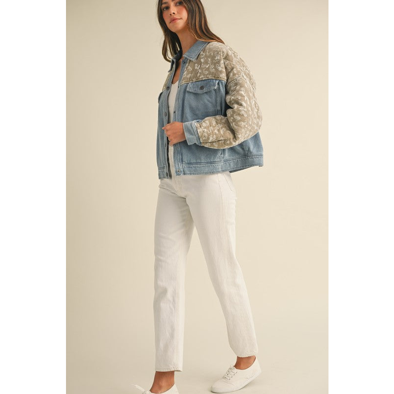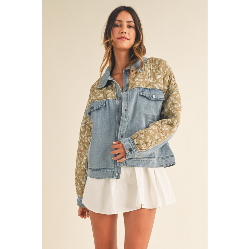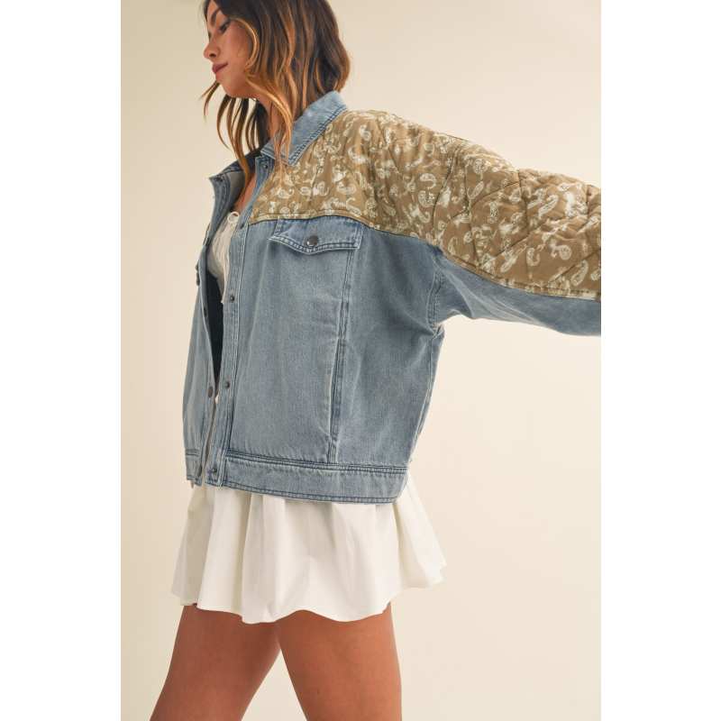 Meet your new layering essential — the Quilted Paisley Denim Jacket. This standout piece blends classic denim with vintage-inspired charm, featuring a quilted paisley print for a unique contrast detail. With long sleeves, a relaxed fit, and lightweight feel, it's perfect for transitioning seasons or adding a touch of effortless style to any outfit.
