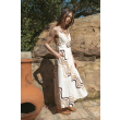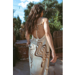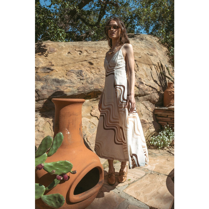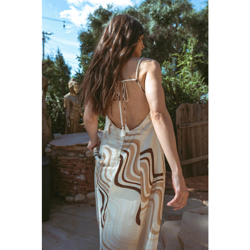 This printed midi-length open-back dress is the perfect summer staple. Featuring a tie-back with tassels, a coconut back button closure, and a plunging V-neckline, it combines style and comfort effortlessly. The dress also includes convenient side pockets, is sleeveless, and comes fully lined for added comfort.
