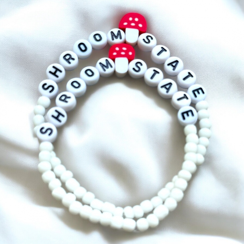 Whether you're feeling spiritual, mystical, silly or ready to hit the club, this fun beaded bracelet is for you or the cottagecore lover in your life. Shroom in on this white glass seed bead bracelet with red polymer clay mushroom seed bead focal point. Acrylic letters spell out " SHROOM STATE."
