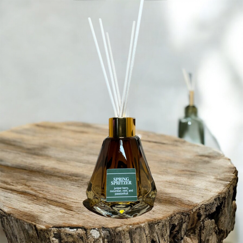 Reminiscent of a fresh spring breeze, the Spring Spritzer is a bold combination of herbal and fruity fragrances that will enlighten your senses. As a part of the gin line, the Spritzer has a base of juniper berry to imitate the main component in the liquor. It is elegantly blended with the fresh essence of cucumber, mint and a hint of passionfruit. Our Reed Diffusers are the perfect way to add some extra fragrance to areas like the kitchen and bathroom, while also adding some elegant decor to your space.