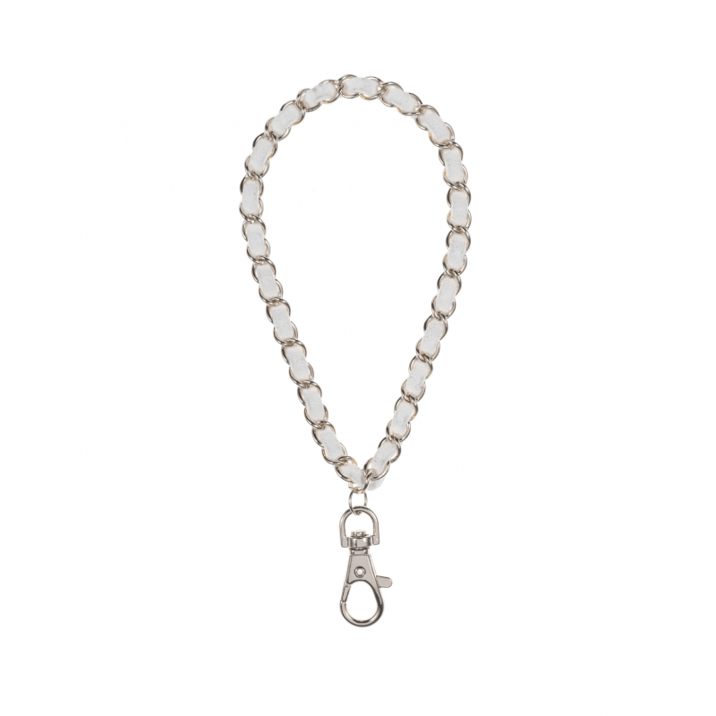 Phone Wristlet featuring Silver Plated Chain w/ 100% White Suede Woven Throughout. Turn your phone into a wearable accessory that keeps you hands-free... think of it as a bracelet for your cell phone!