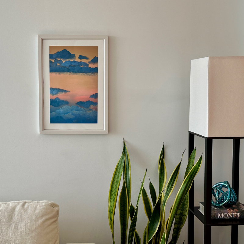 14' x 20' print of "Out of the Blue, I Fell for You" printed on Hahnemuhle German Etching paper. This paper produces a textured matte reproduction of the original painting that is crisp and colorful. Printed with a 2 inch white border all around for easy framing. Frame not included.