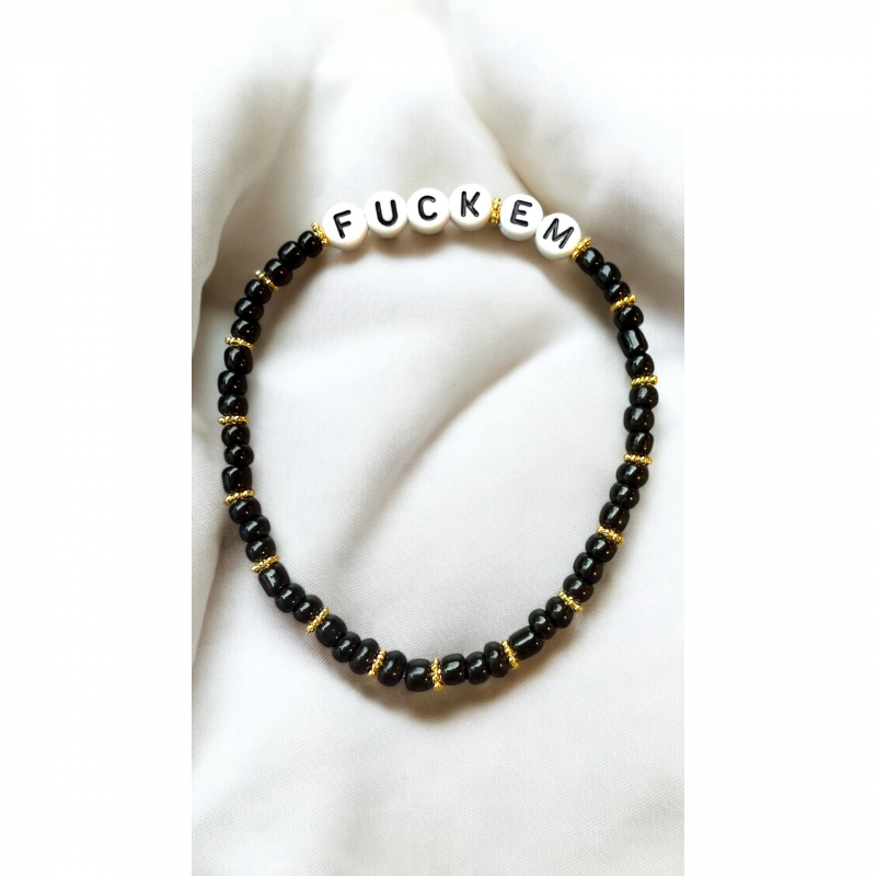 Wear your thoughts on your sleeve or send a thoughtful gift to a friend in need of some blunt advice. Matte black glass seed beads with gold-colored nickel-free metal alloy accents. Unisex and great for men or women. Looks good on its own or stacked with other bracelets or precious jewelry/watches. Acrylic letters spell out "FUCK EM."