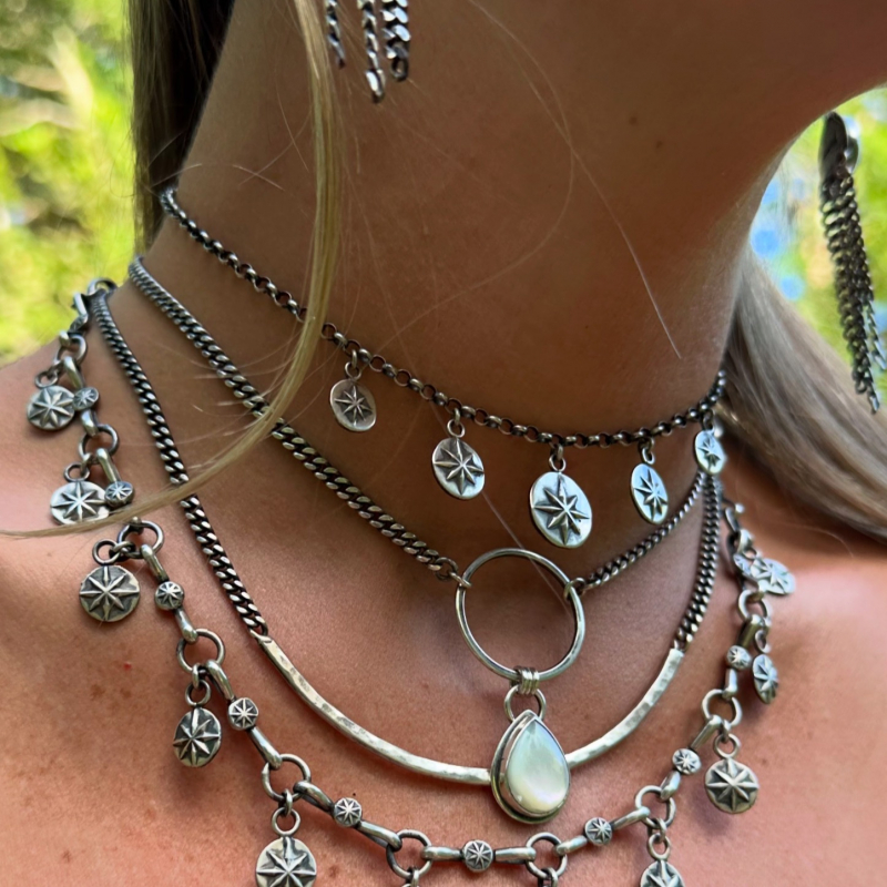 Hangs from a 17” solid sterling silver chain. The clasp attaches anywhere on the chain so can be worn as short as wearer would like.